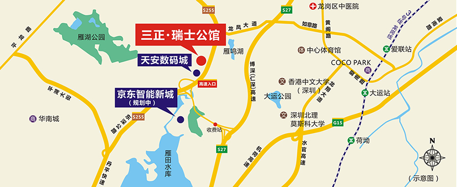 “京東·都市人工智能產(chǎn)業(yè)新城”項(xiàng)目位于鳳崗鎮(zhèn)雁田村,距離三正瑞士公館僅幾百米距離。